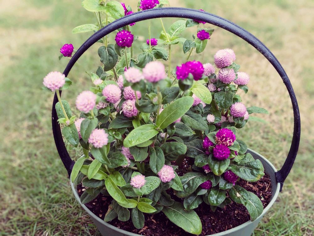 ピンクの濃淡の千日紅が 丸い取っ手の花器に入ると もっと可愛くなりましたね🥰