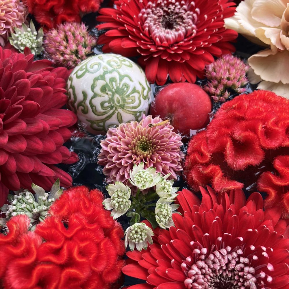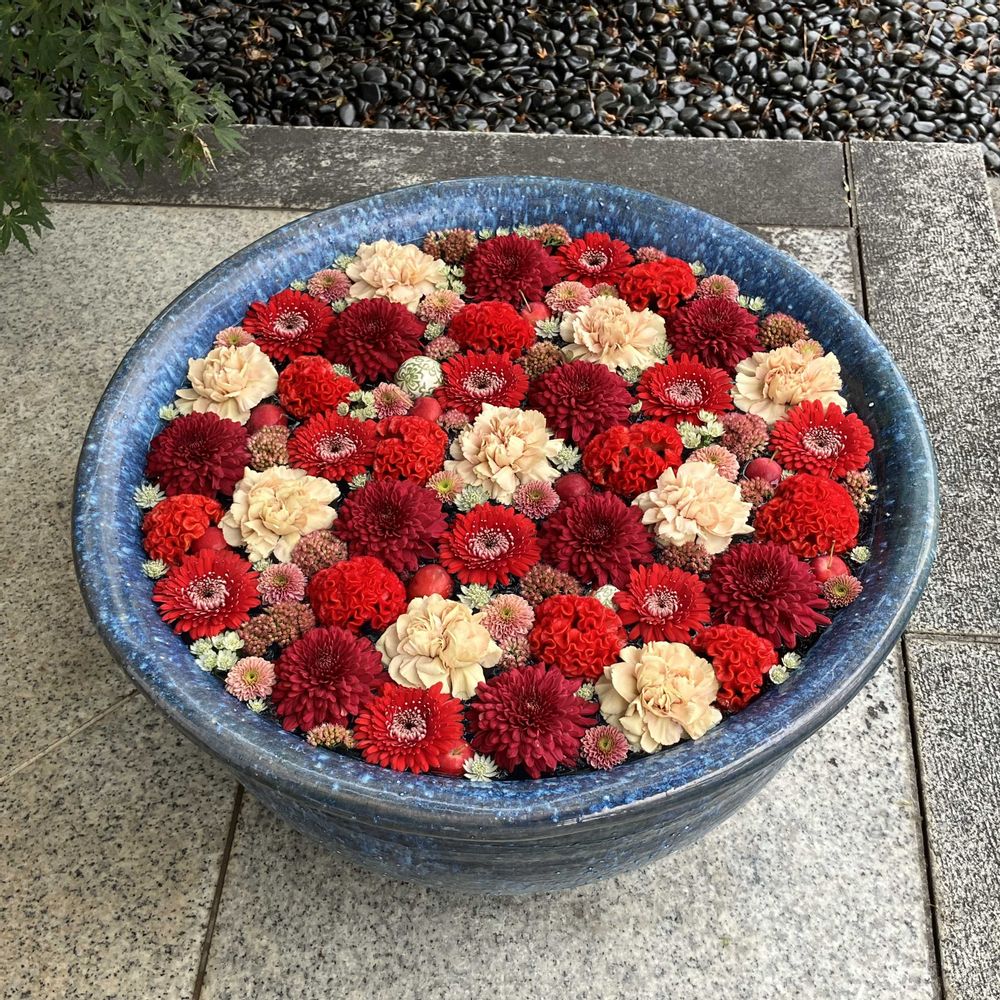 真っ赤な花手水にパワーもろて、庭片付け始めよう🔥💪