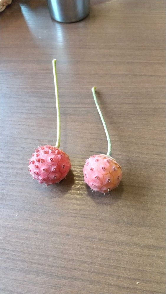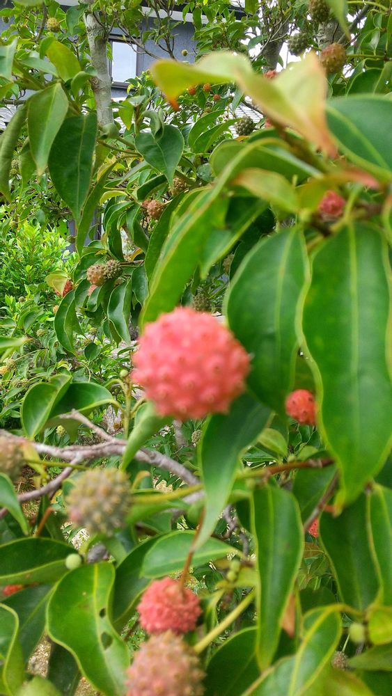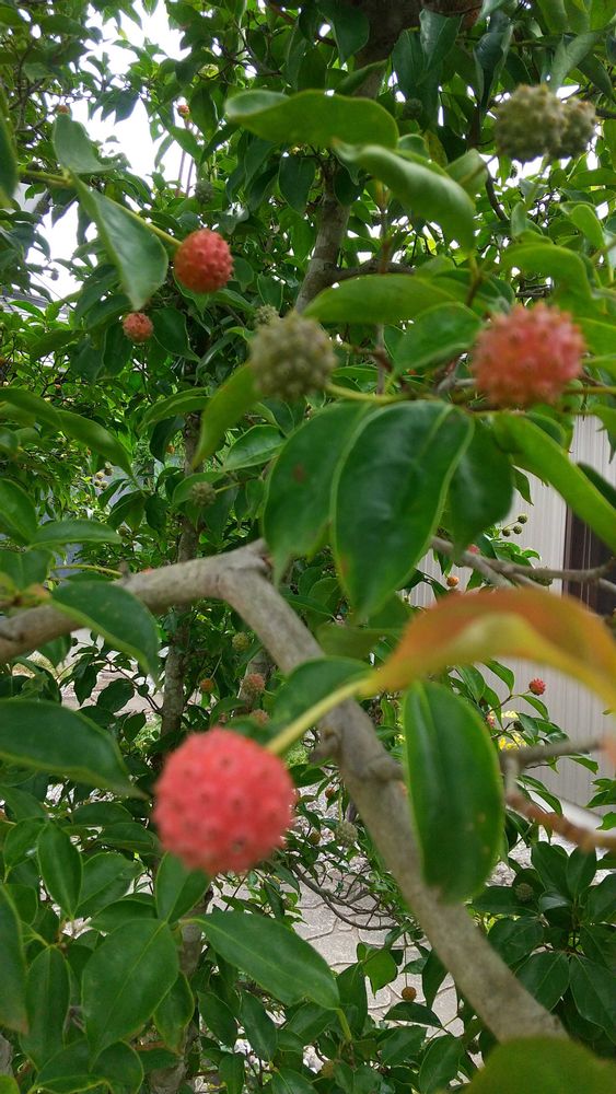 モーニング珈琲に出かけた店の庭でヤマボウシの実が赤く実っていました。🍎