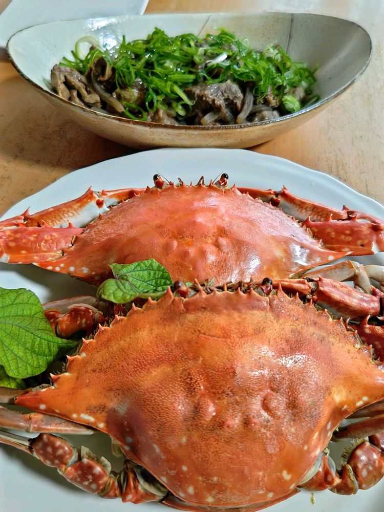 お祝いに、ワタリ蟹🦀買って塩茹で😁今夜は録画見ながら祝杯🍻。常備菜🏷は、すじこん😋。牛すじを圧力鍋で下茹で。こんにゃくはつきこんにゃく。青ネギ一杯盛って😁。