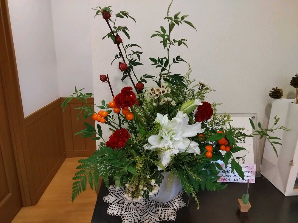 白い八重の百合が引き立つ、コニカル=ソケイ(唐辛子の仲間)と