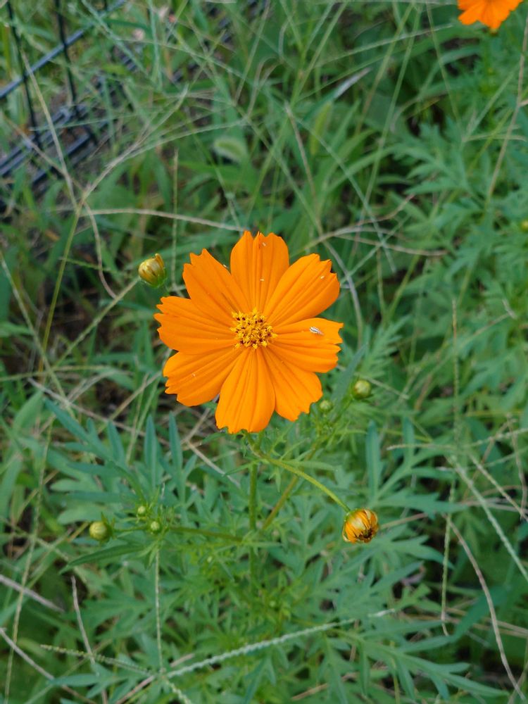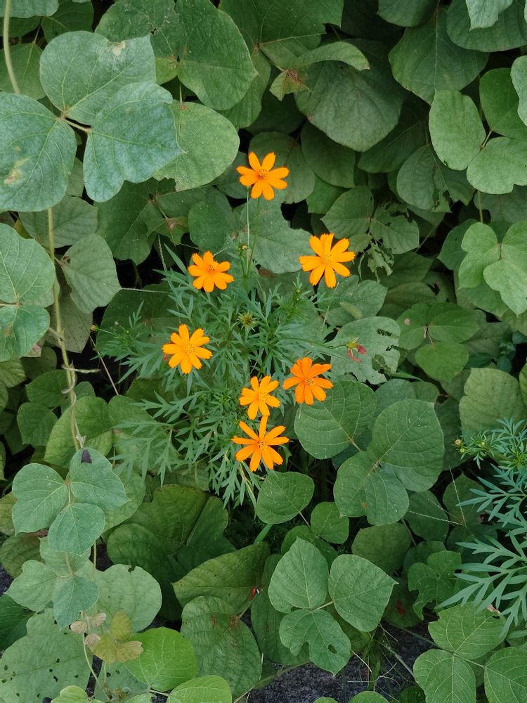 散歩コース終盤、川べりの遊歩道を歩くと、こんな感じでキバナコスモスが咲いています。かわいい顔して、けっこうな繁殖力のようです😮