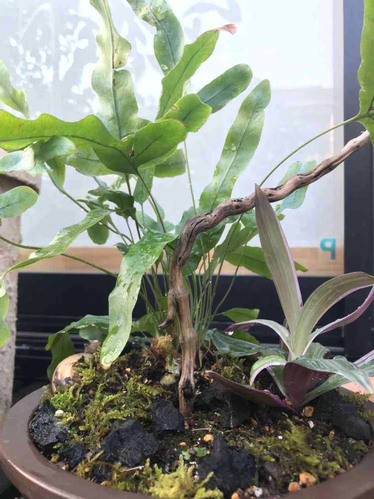 ヘタっとして50円で売られていたシダと、100均でボロボロになっていたムラサキオモトを寄せ植えてみました。