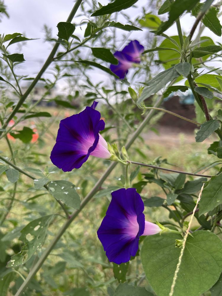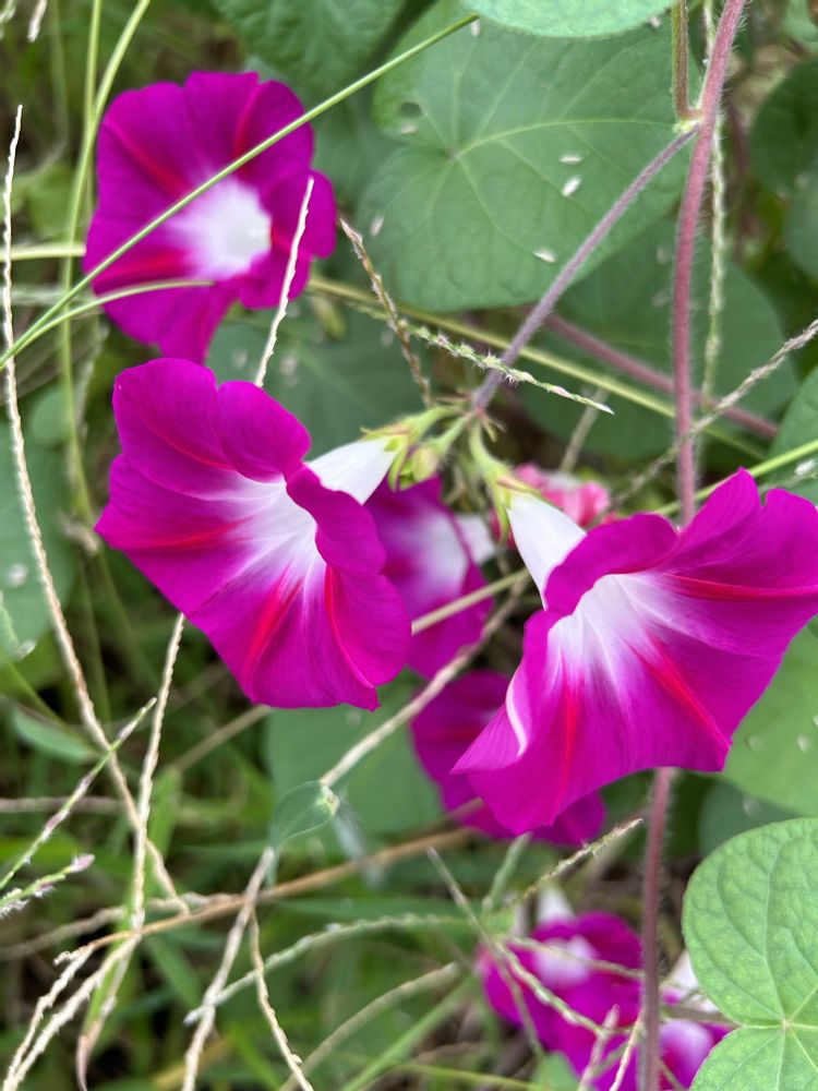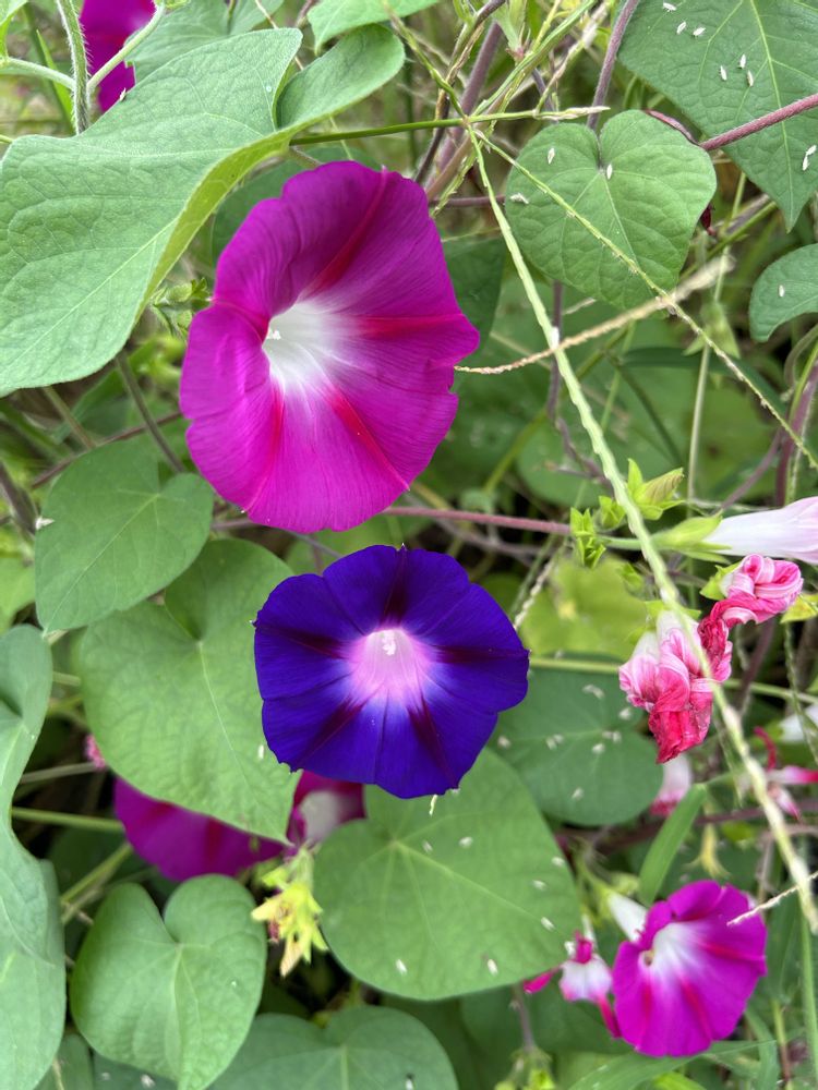 野生のアサガオがキレイに咲いています。色違いで2種💜💙🩷💚💚💚