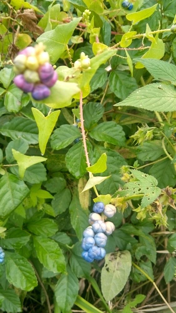 蔓に、痛いとげが沢山生えて、葉が三角です。ごちゃごちゃの草やぶに混じっているので分かりづらいのですが。