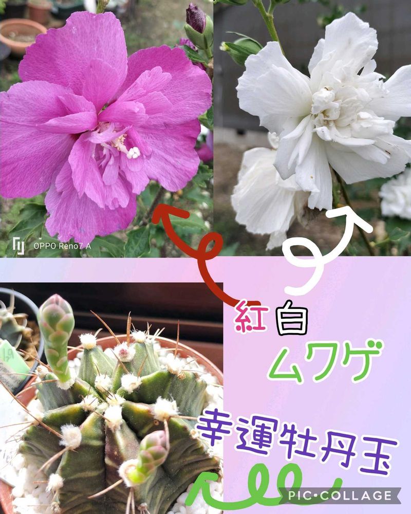紅白二本のムクゲいっぱい咲いてくれてありがとサンガリヤ😄