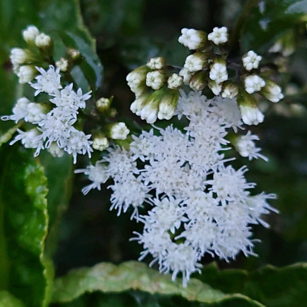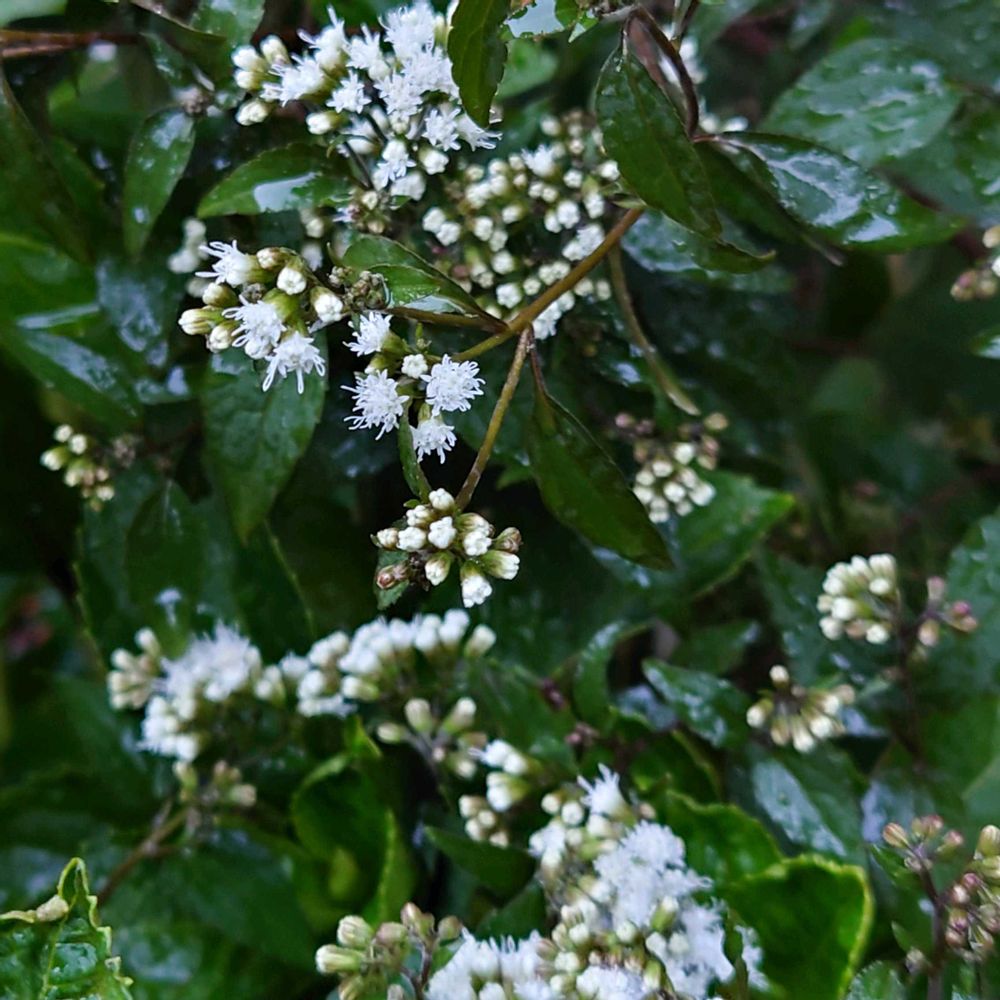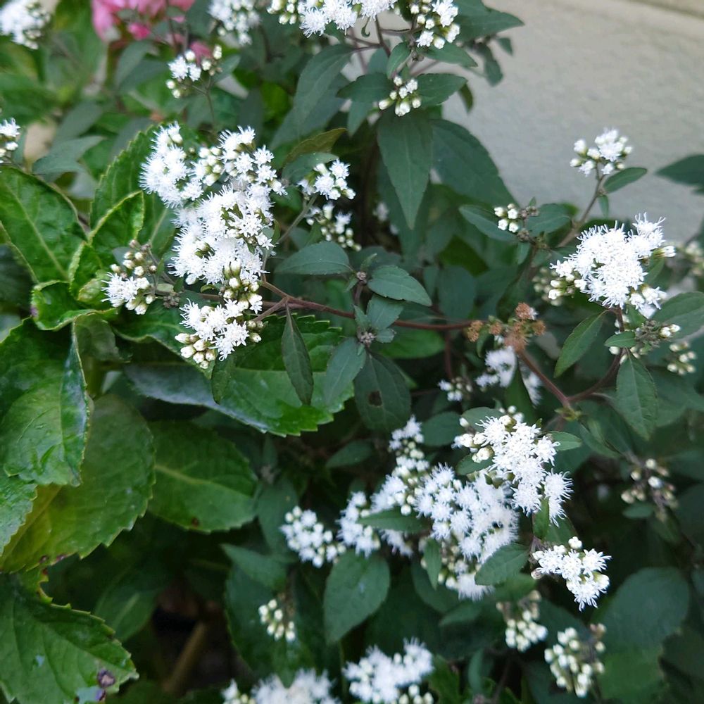 コレ、先日のフジバカマの仲間らしい事を初めて知りました〜黒っぽい葉っぱと茎に白い花が可愛んです〜🤍✨