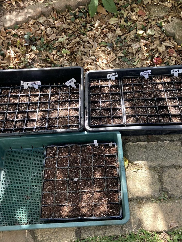 ②秋の種まき 上の2トレイは2-3ヵ月冷蔵庫で保管していたクリスマスローズ色々。1年で花を咲かせるにまたまた挑戦。下の緑のトレイは花友さんからいただいたフロックス。上手く発芽しますように