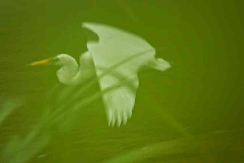 水辺の緑に屈み込んで慌てて撮った飛翔白鷺、ピンは勘だけ流し撮り🤗💦