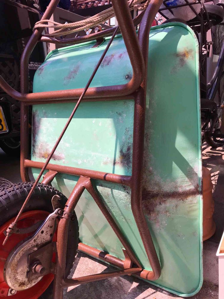ライトグリーンで錆止めした一輪車にサビペイント( ´•౪•`)⌒☆