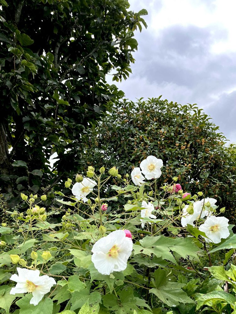2 今朝の酔芙蓉は🤍🤍🤍の花と萎んだ🩷🩷 夜のウワーッと降った☔で🌸は落ちてしまったよう。