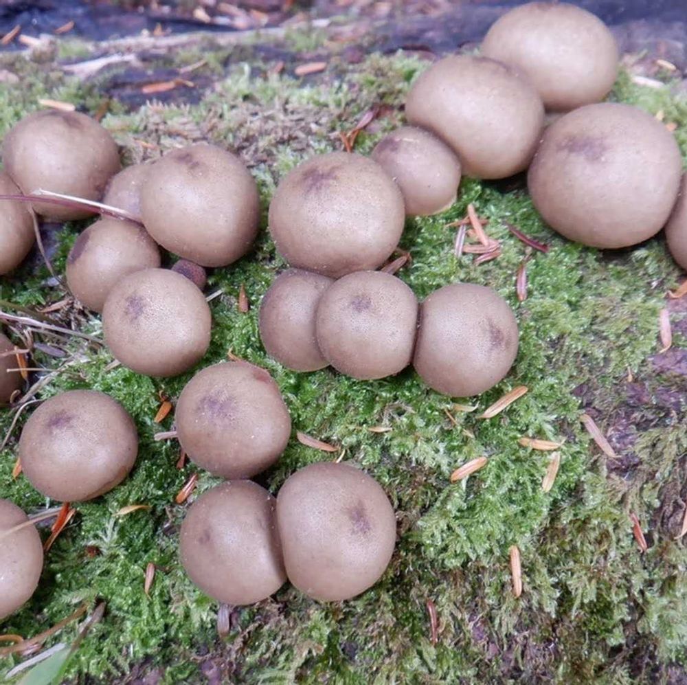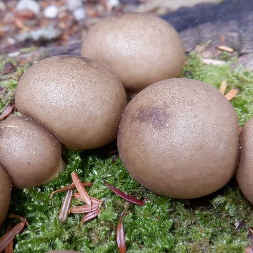 今まで見たホコリタケはどれも地面に生えていたんだけど、これは枯木の幹のコケの上に生えてるんだよね。