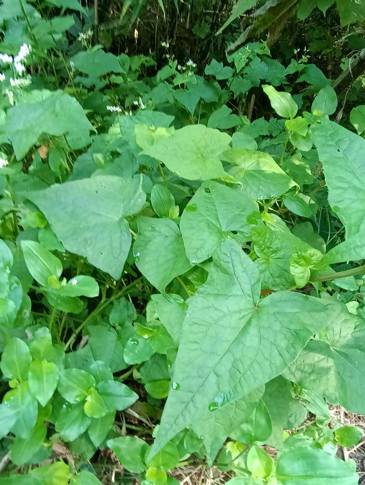 北インドから中国原産。昭和のはじめに小石川植物園に栽植され、近年も薬用として栽培されているが、逸出して各地に野生化している。茎は根茎より束生し高さ50〜100cm、無毛、中空。葉は長い柄があって互生、ほぼ正三角形、葉柄の長さ3〜10cm。上部の葉腋から長い花枝を出し、先は2〜4個の短い枝に分かれて、白色の花をつける。花は直径5〜6mm。果実は3稜のある三角形。黒褐色。花期は秋。