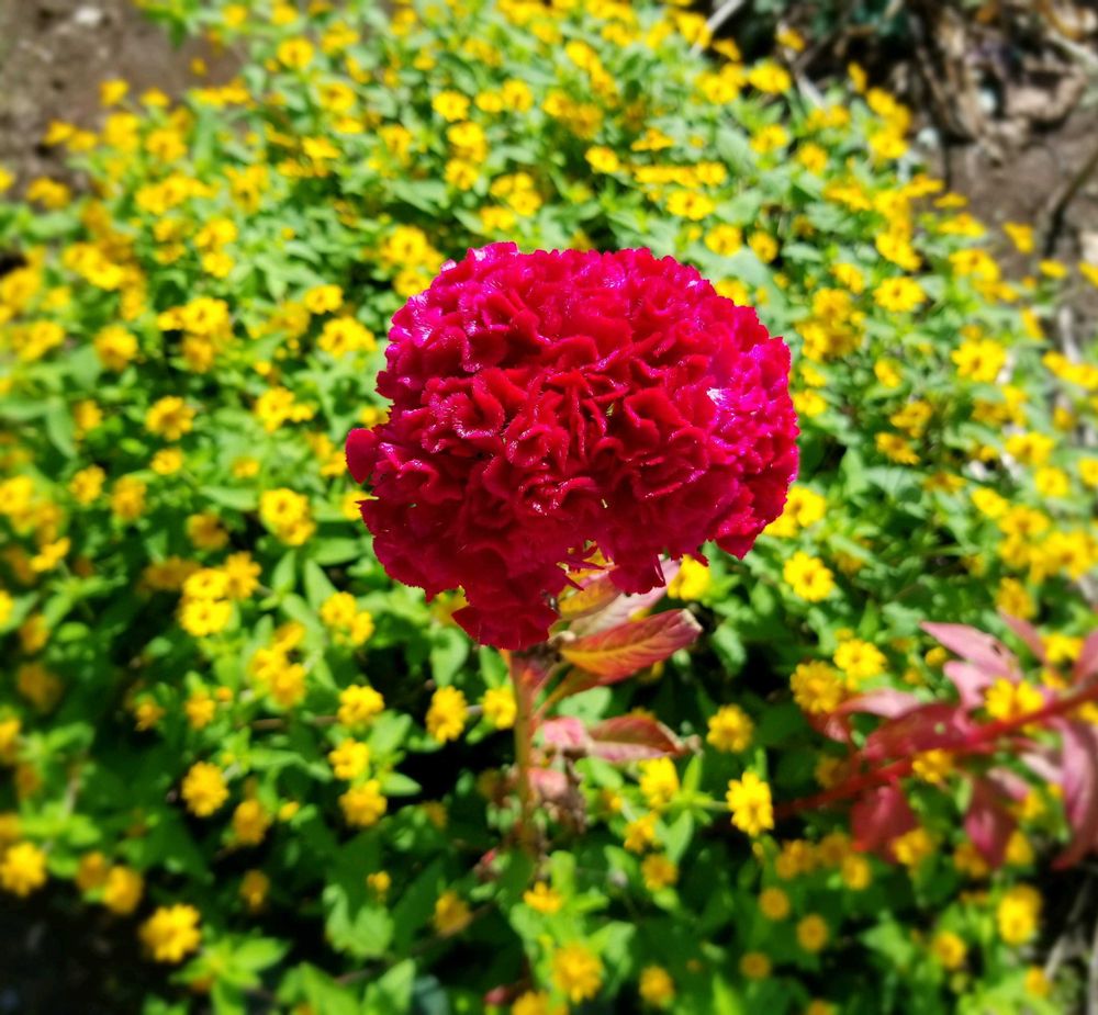 ①ケイトウとメランポジウムが綺麗に咲いています(零れ種から)