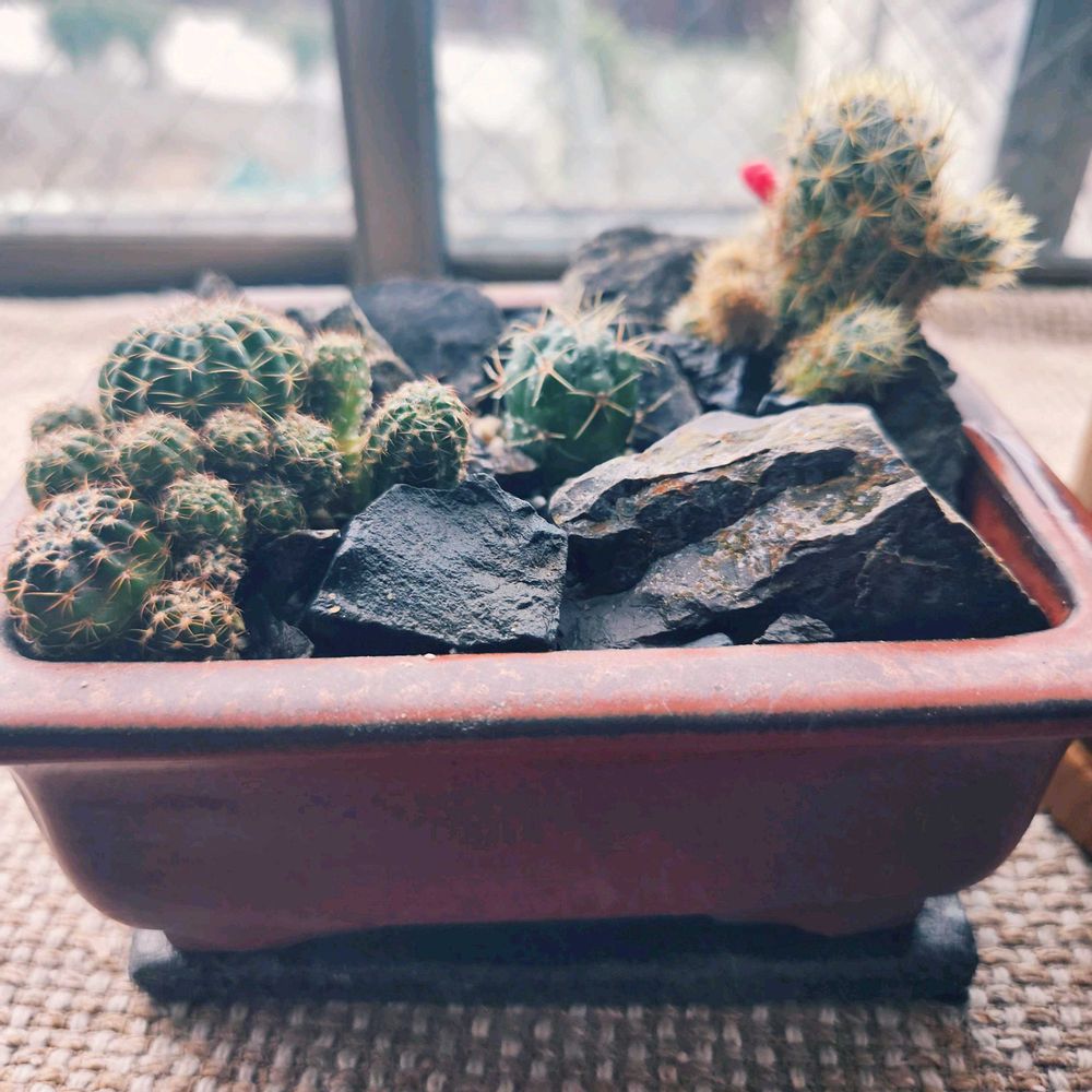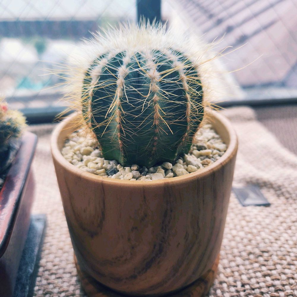流石にマズそうなのでこれまたダイソー系列スタンダードプロダクツの木目調鉢に植え替え、空いた元の鉢には緋花玉の子株を配置🙂