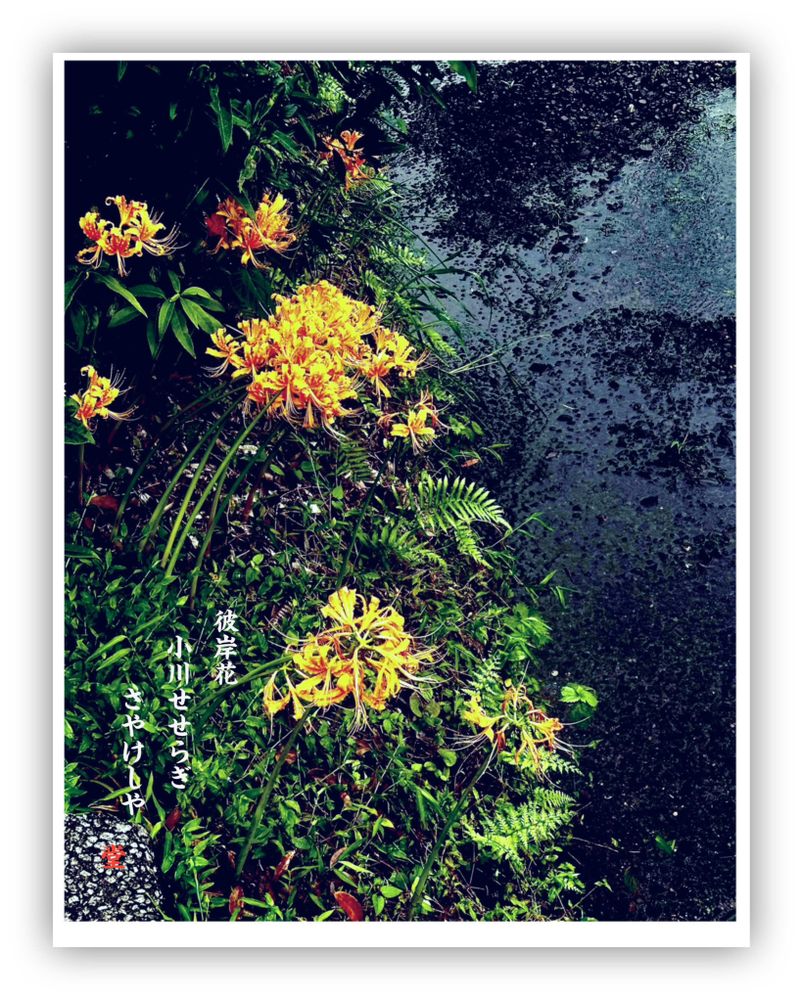 @訳意:The yellow spider lilies are in full bloom, and the sound of the babbling brook is refreshing and cool.