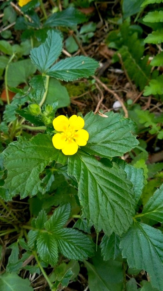 ヘビイチゴ? 家の庭にも勝手に生えていました。種で増えるのでしょうか。