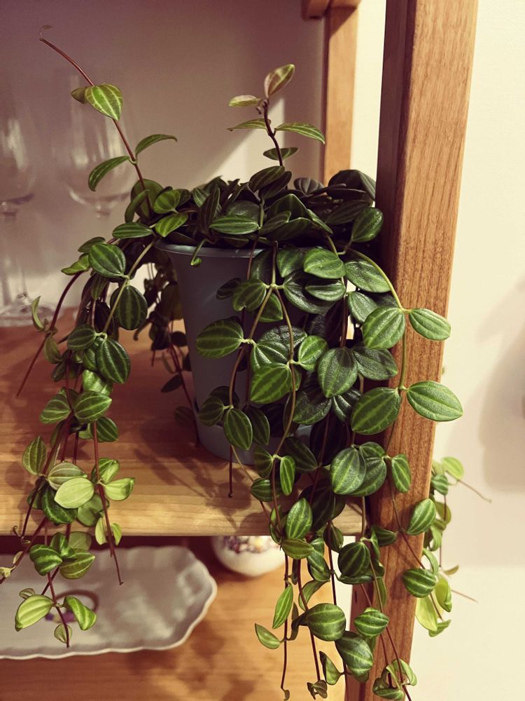 ペペロミア•アングラータ、シェルフに飾りました。見た目フェイクグリーンです^_^可愛い😍