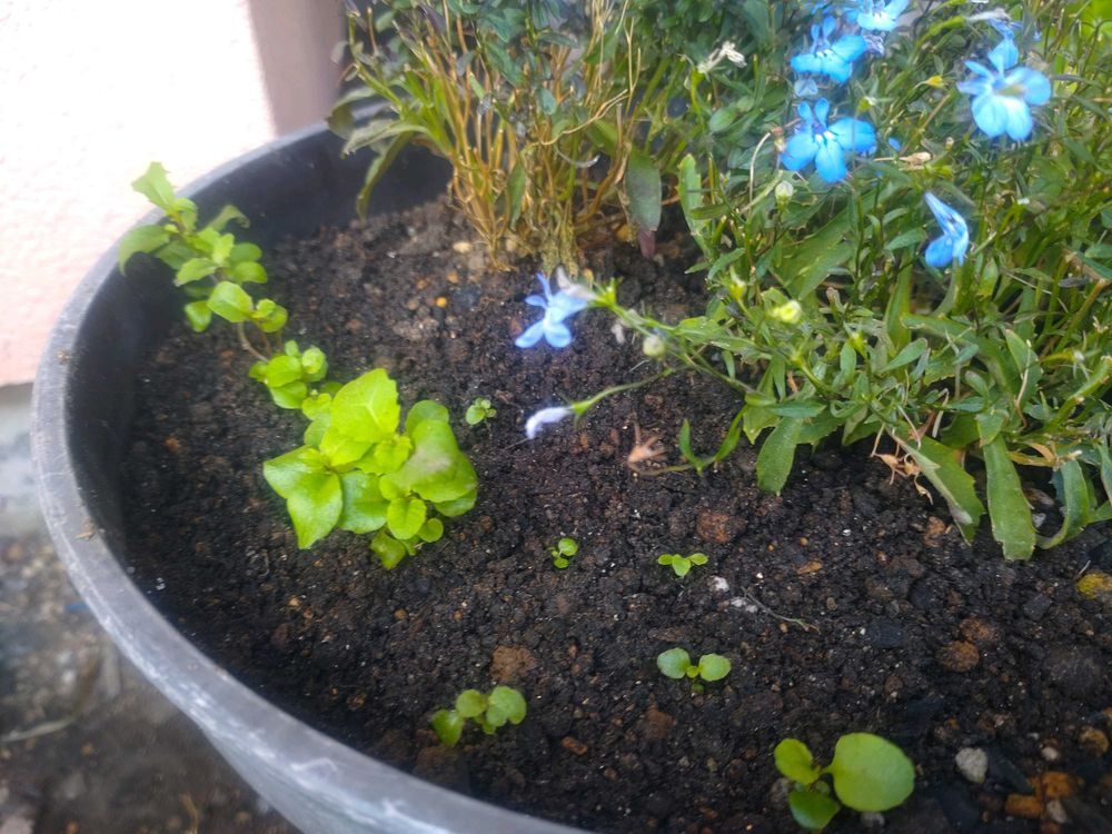途切れずに細々と咲いている傍らで こぼれ種からの芽🌱
