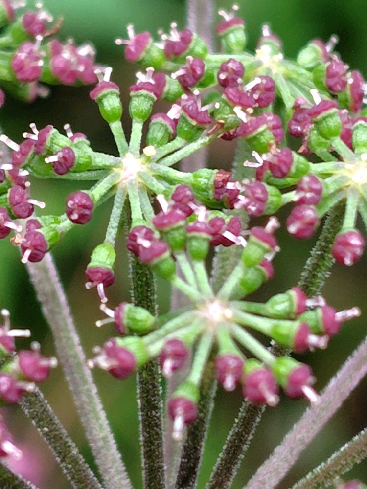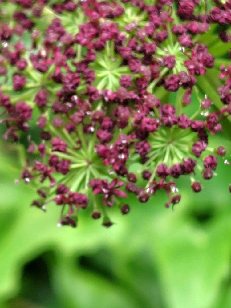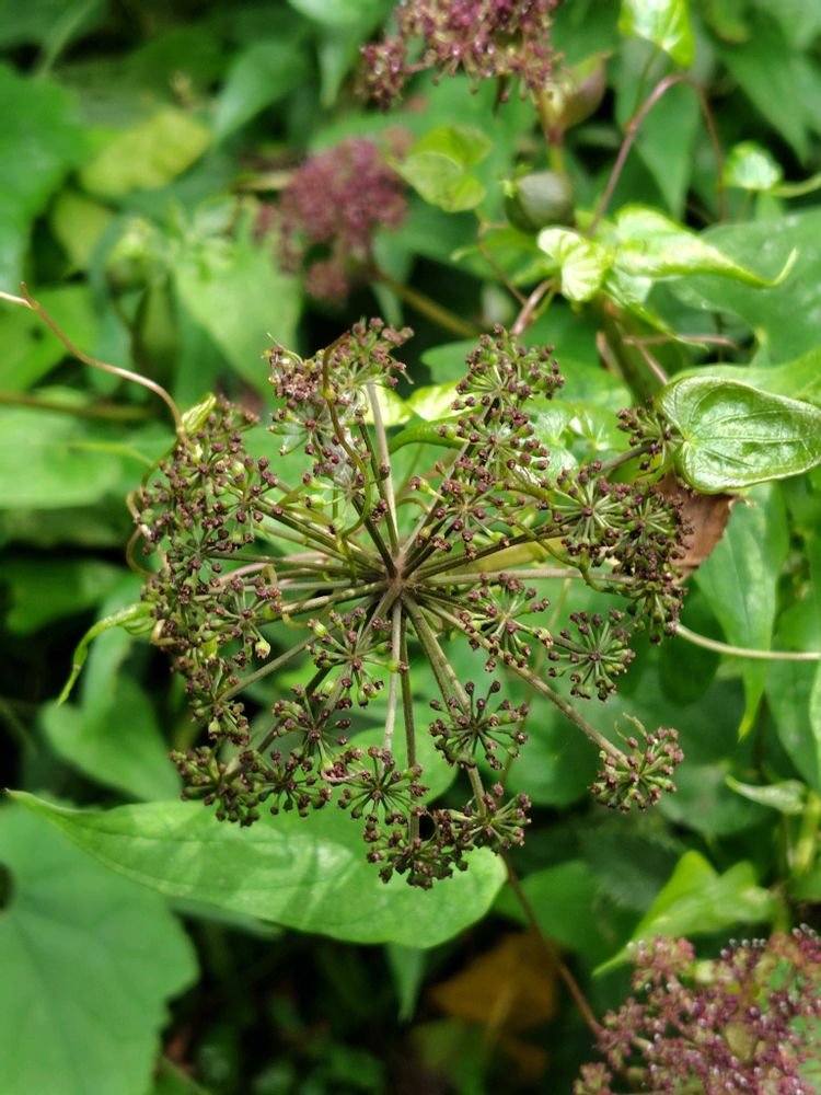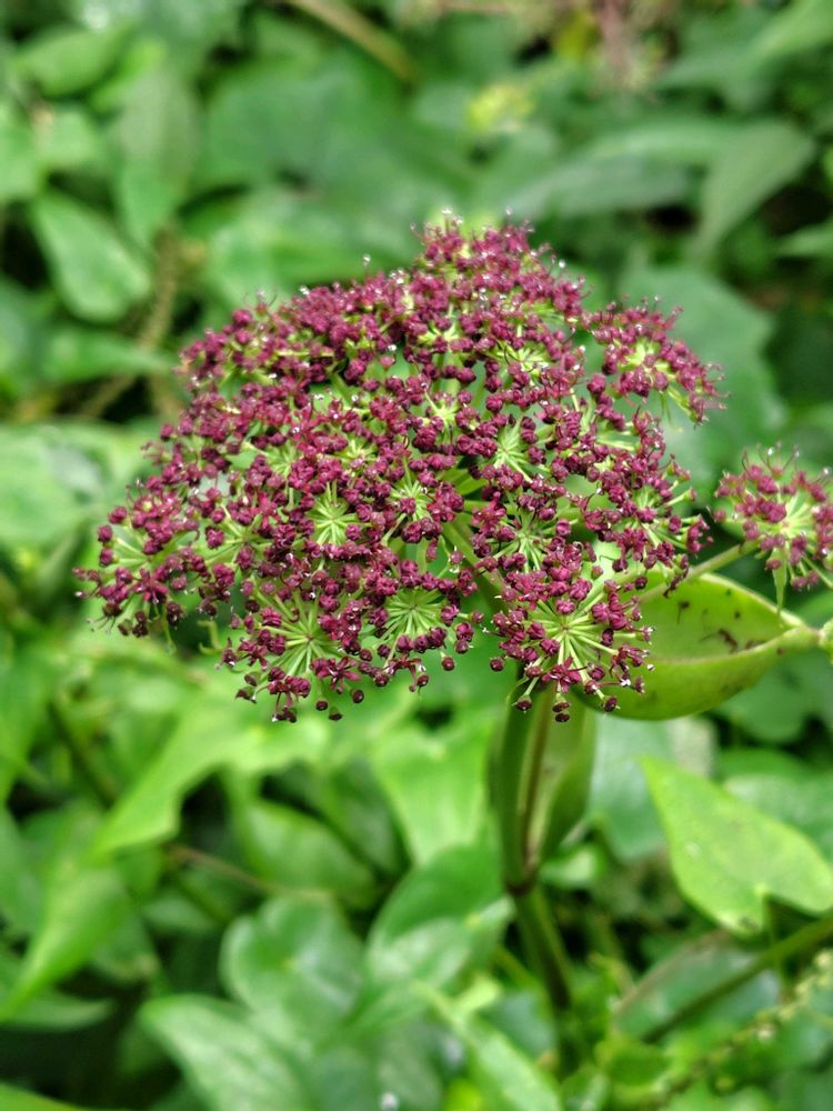 アジサイと同じように、小さな暗紫色の花が集まって傘状になる。