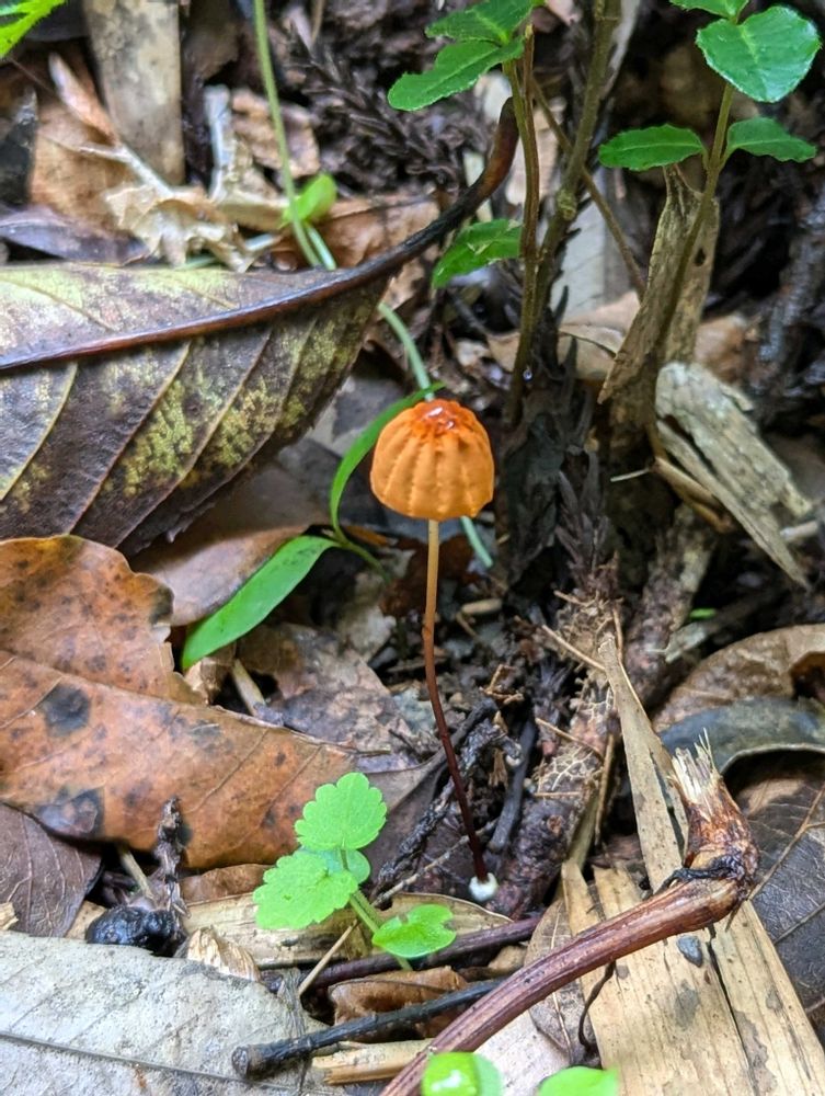 ハリガネオチバタケは、傘の直径が1〜3cmほどで、 ヒダの数が13〜15本くらい😳