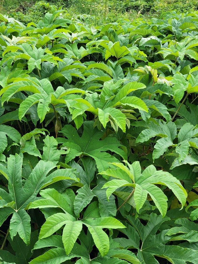 カミヤツデの花は淡黄白色の丸い小花の塊で、その塊の集団が円錐形になる。(Wikipedia)