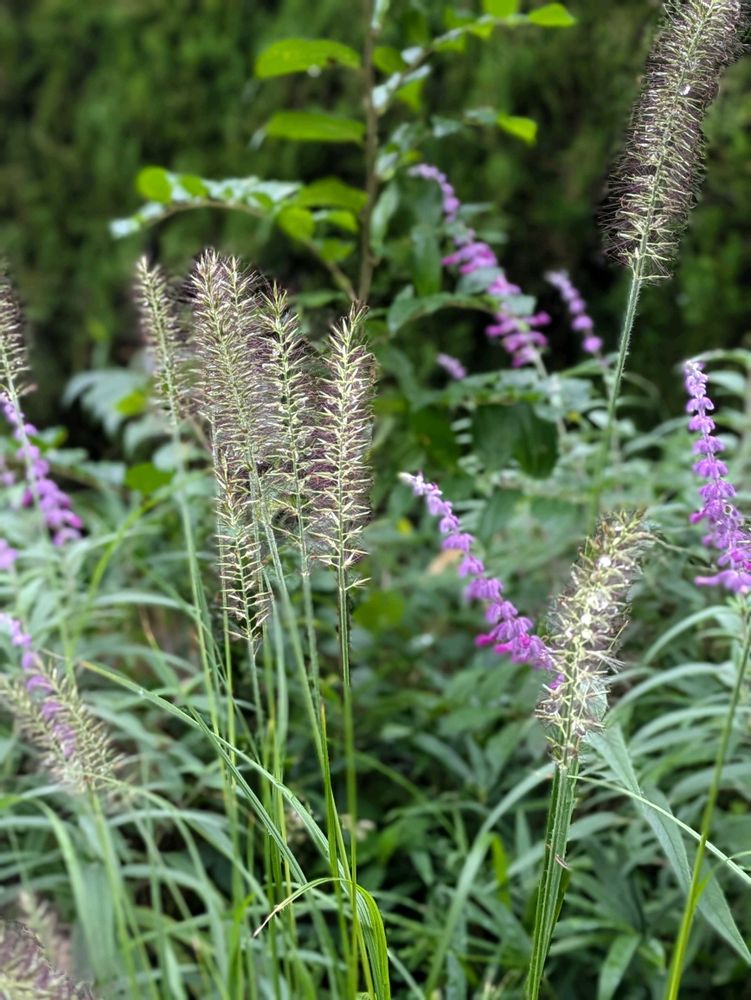 ①アメジストセージに混じるチカラシバ イネ科 チカラシバ属 あちこちで今盛です。マンションの庭で
