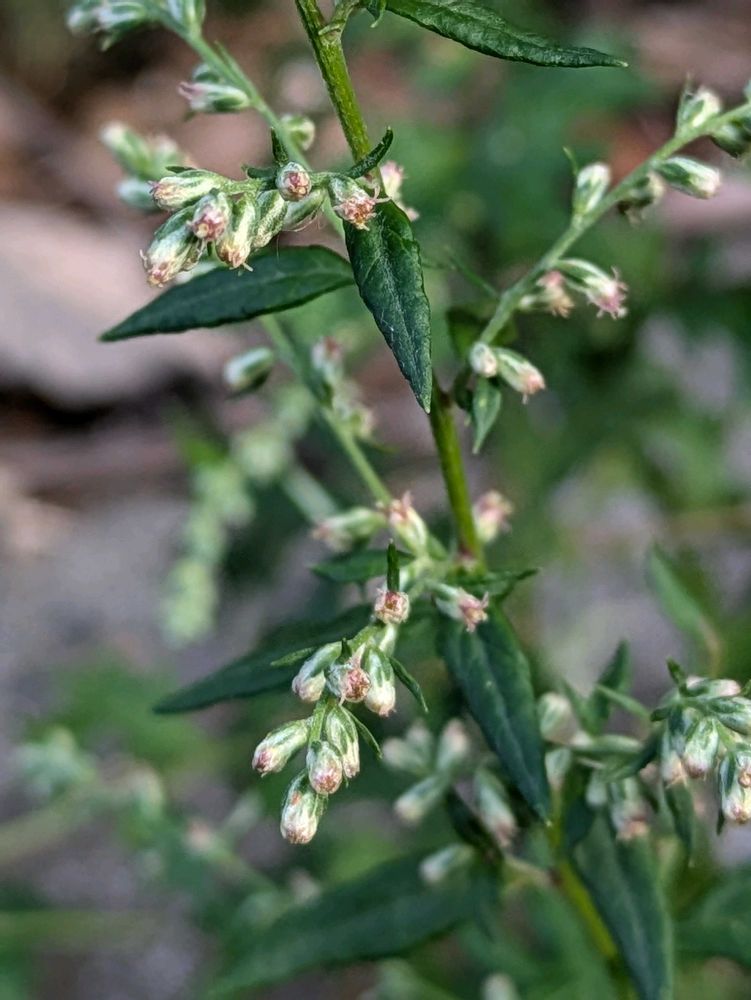 ②この花はヨモギ、多分。でも葉は裂けていない。ヒトツバヨモギ?別名ヤナギヨモギ キク科 ヨモギ属