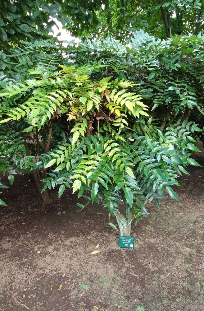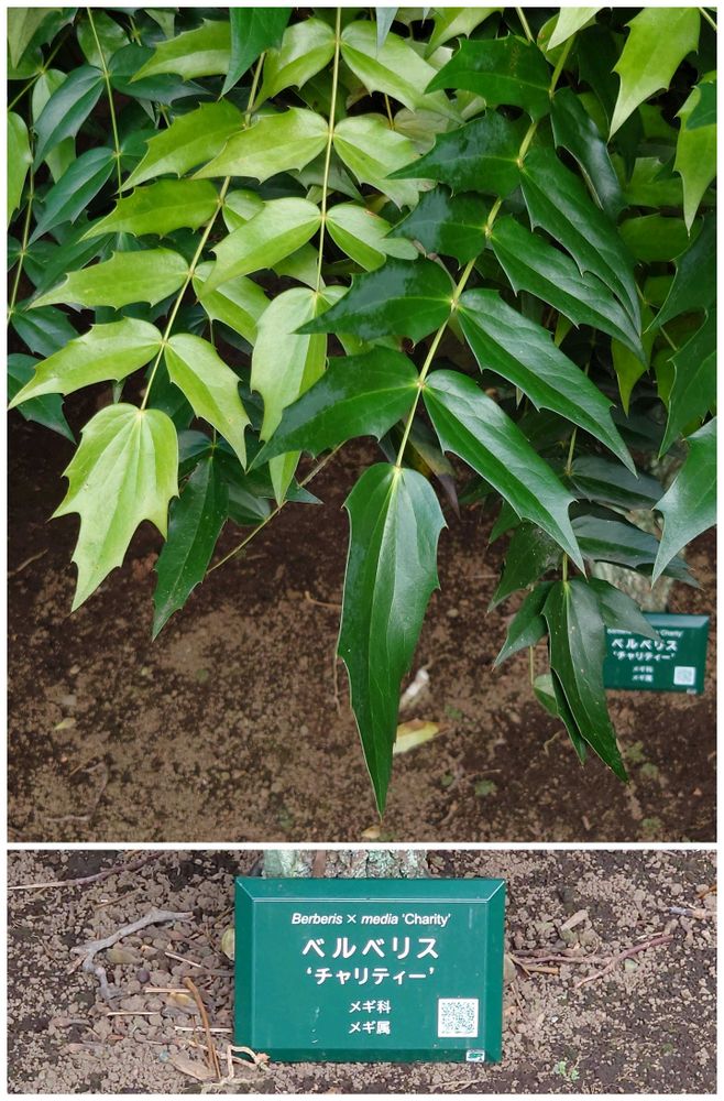 メギ科メギ属となっていますが、検索してみると、「ヒイラギナンテン属に分類されていた」とありました🔍️ 変わったんですね。そんなことがあるんだぁ😮 たしかにヒイラギナンテンの葉っぱににていますよね😀(農業試験場内にて)