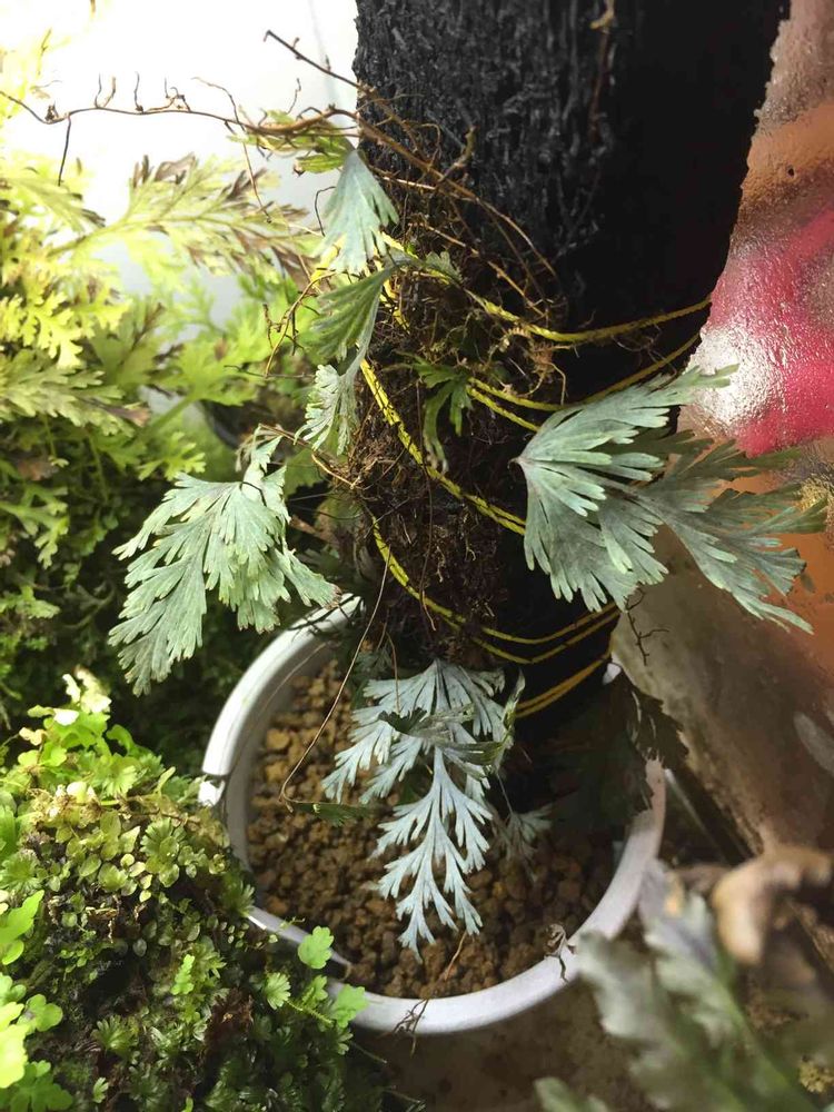白いコケシノブと呼ばれるプレウロマネス パリダムです。左横にある同科のシダたちとは異彩を放つ色合いです。