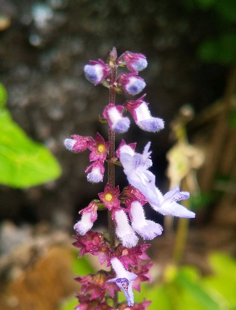 ハッカ(シソ科)に似て、山に生えていることからこの名が付いたそうですが、ハッカの香りはしません。小さな花が枝先に集まって穂のように咲き、上の花びらは4つに裂けて立ち上がり、濃い紫の斑点があります。下の花びらは2つに裂け、前方に突き出してふちは内側に巻いています。