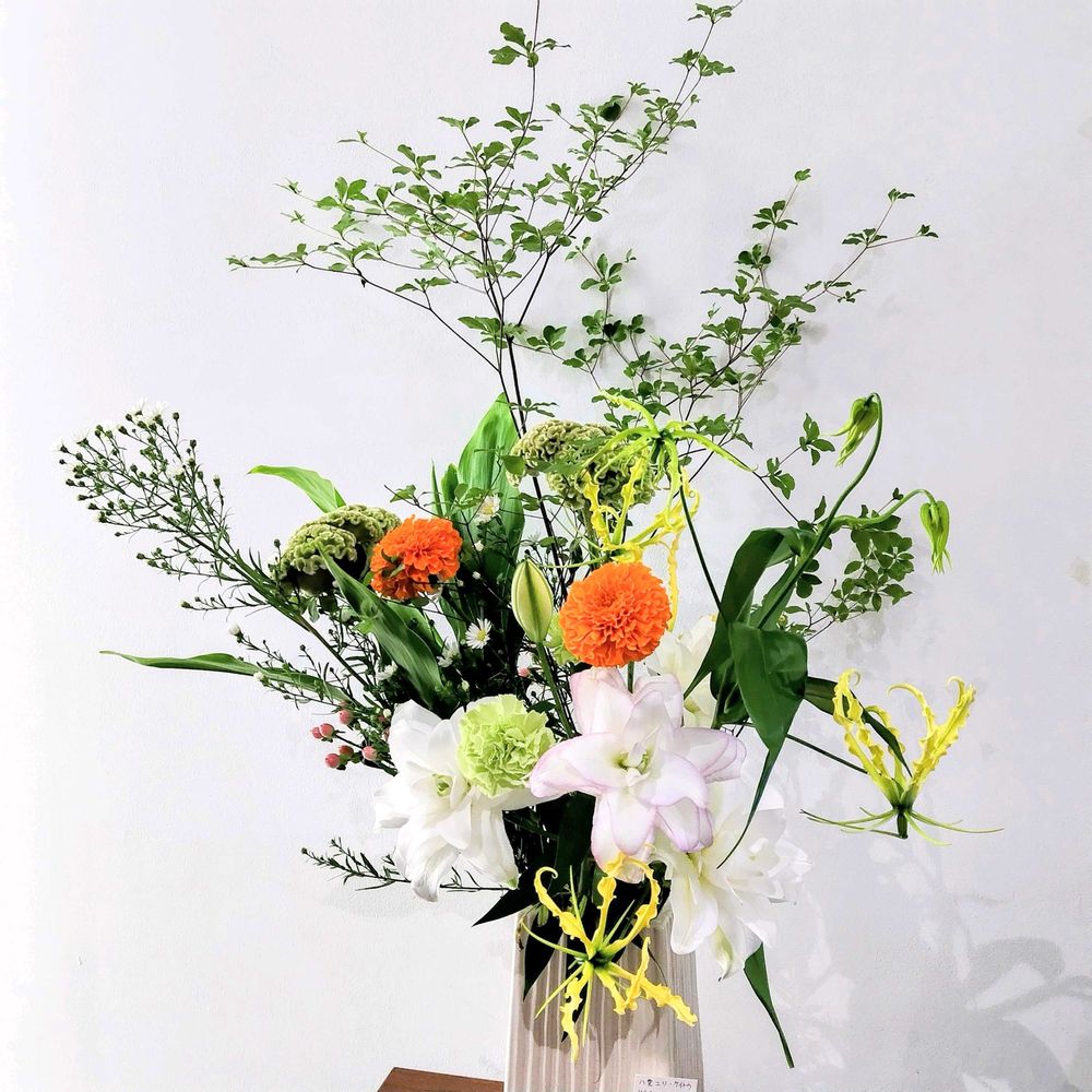 今週の花材は、ドウダンツツジ、ケイトウ、八重ユリ、カーネーション、マリーゴールド、クジャクソウ、ヒペリカム、グロリオサ です✨