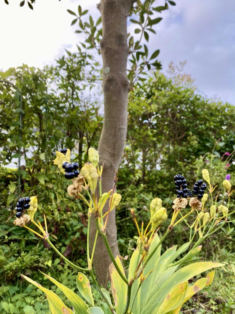 根元にヒオウギさんの実が弾けて黒豆沢山⚫️⚫️⚫️⚫️⚫️⚫️🎶🎶