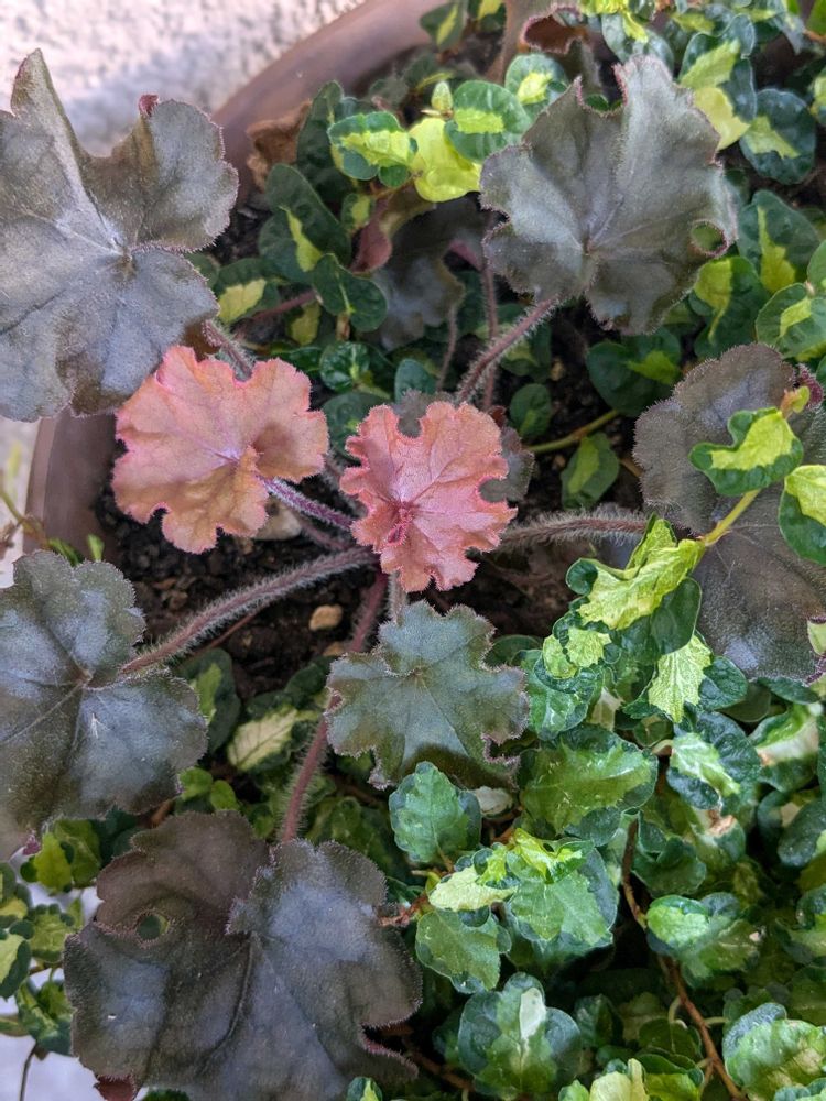 寄せ植えにして…毎日水やりしたら…ヒューケラだけ枯れちゃって、花屋さんに聞いたら水やりし過ぎだったみたい😅土が乾いたらたっぷり水やりです。2代目はどうにか根付いて新葉が出ました。🌱🌱