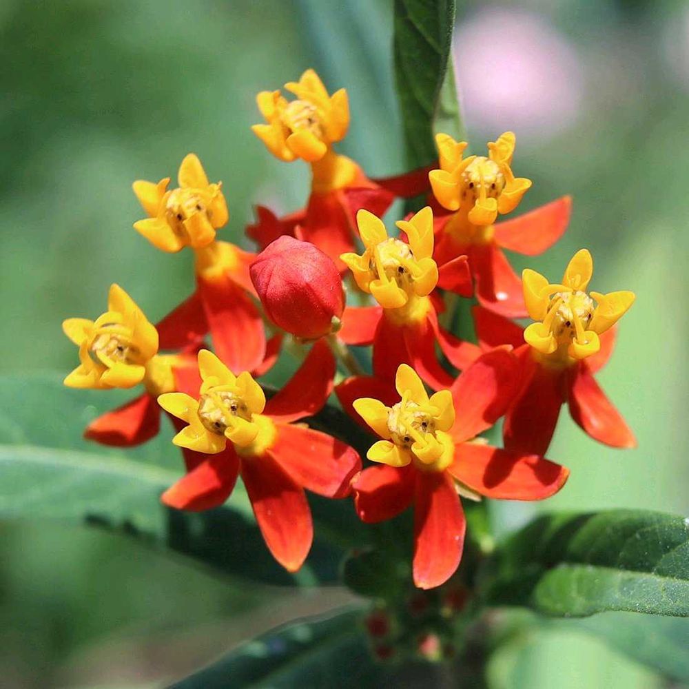 初夏~秋、茎頂に鮮やかな赤橙色の小花を散形状に密に付ける。
