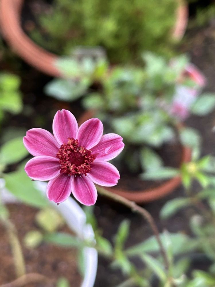 友達とお揃いで買ったチョコレートコスモスは、すこし大きな鉢に植え替え