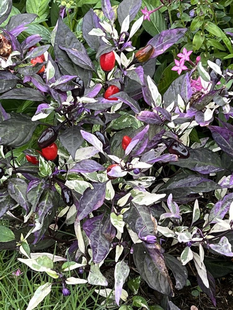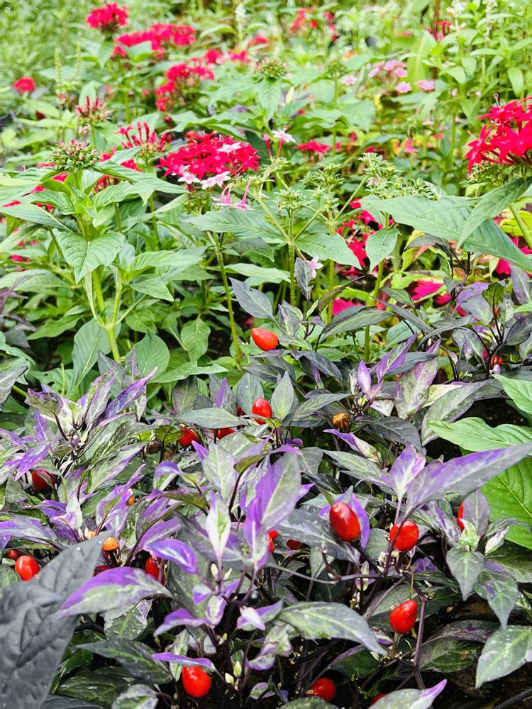 葉唐辛子のパープルフラッシュのシックな紫のグラデーションと熟した真っ赤な実、そして真っ赤なペンタスが素敵でした🫶🏻💜🫶🏻❤️🫶🏻