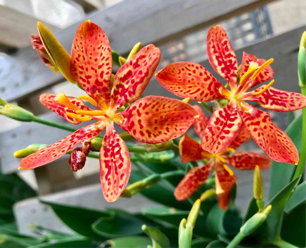 京都の祇園祭には軒先きに厄除けとして檜扇を飾花される花文化の伝統があるそうです。また万葉集の中で歌われる枕詞『ぬばたま』は檜扇の黒い実のことです。古典的な美しいお花ですね。葉も扇の様な形です。