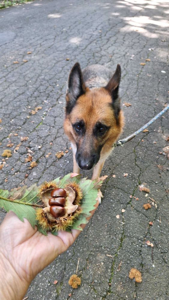 ①🌰がゴロゴロ落ちていてつい拾って来たものの ②実はこ~んなサイズ感🤭売ってる物の1/3位🙄 名古屋では…③ロイの散歩コースの私の母校前の公園に彼岸花の蕾 ④比較の為橫に座らせました。何か悟ったかのような顔🤣 ⑤まだ、百日紅も残ってます。