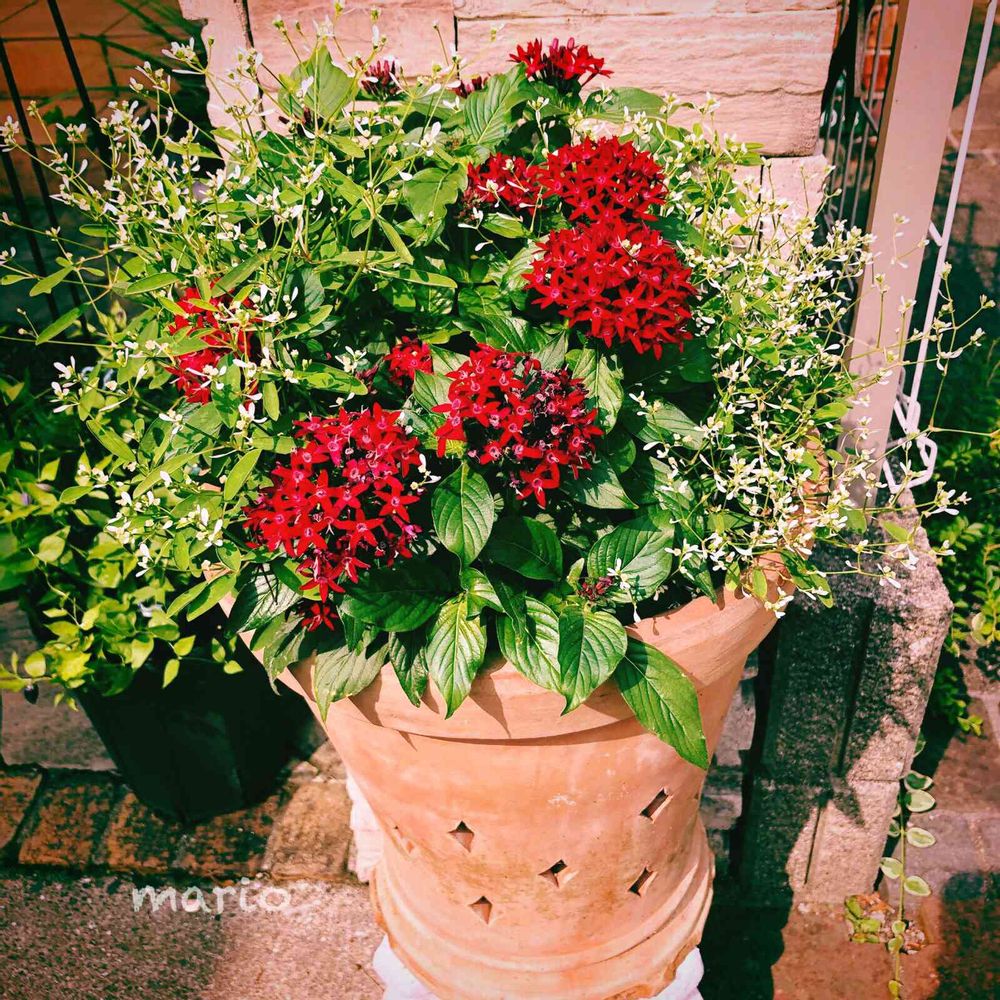 門柱前に対で並べてるペンタスとユーフォルビアダイアモンドフロストの寄せ植えが、こんもりして来ました♡