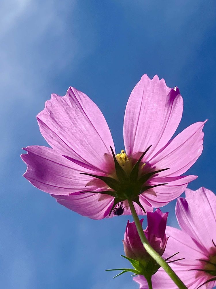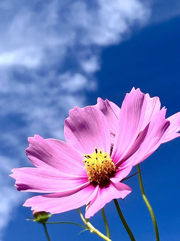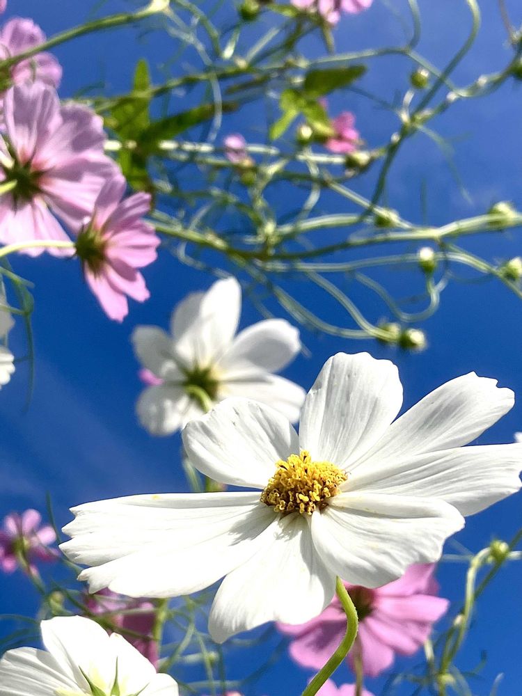 青い空に向かって咲くコスモスのお花が