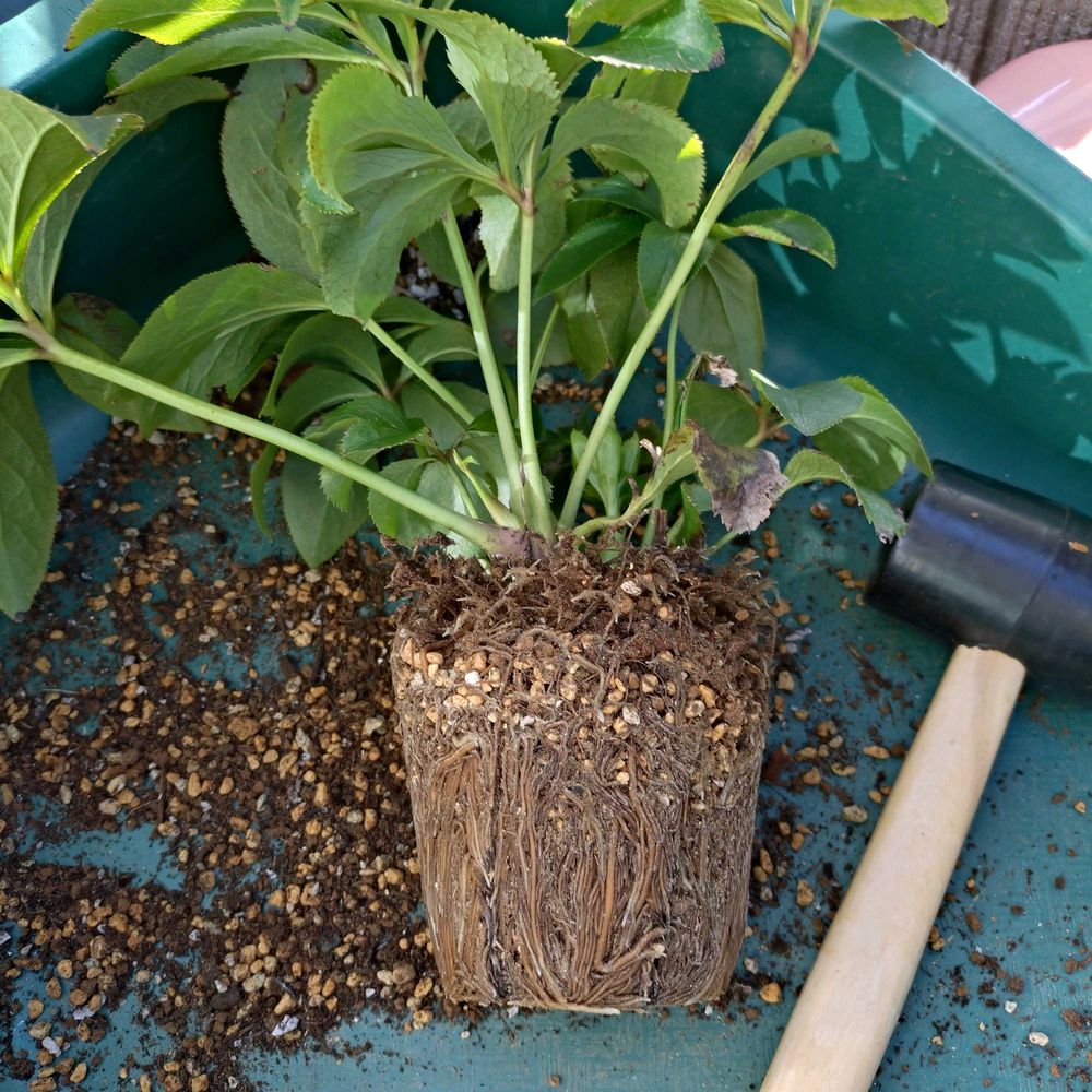 ゴムハンマーを使って根っこをほぐし、5号根張り鉢から6号ロングスリット鉢へ増しました😃(画像4枚目)