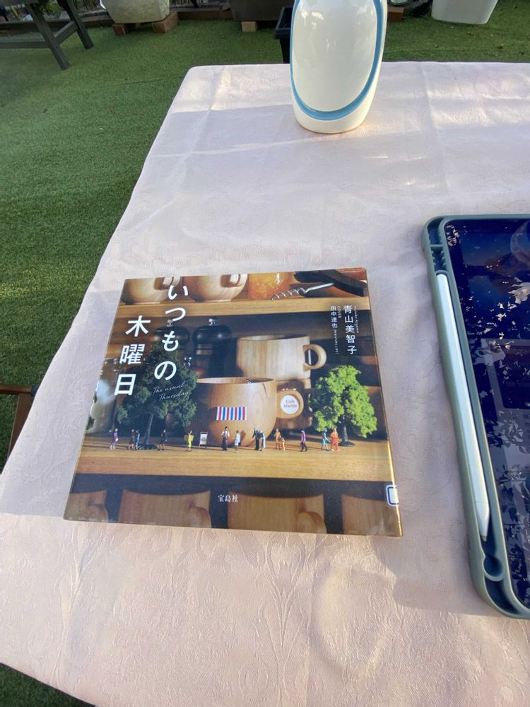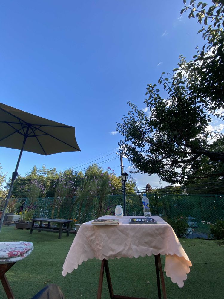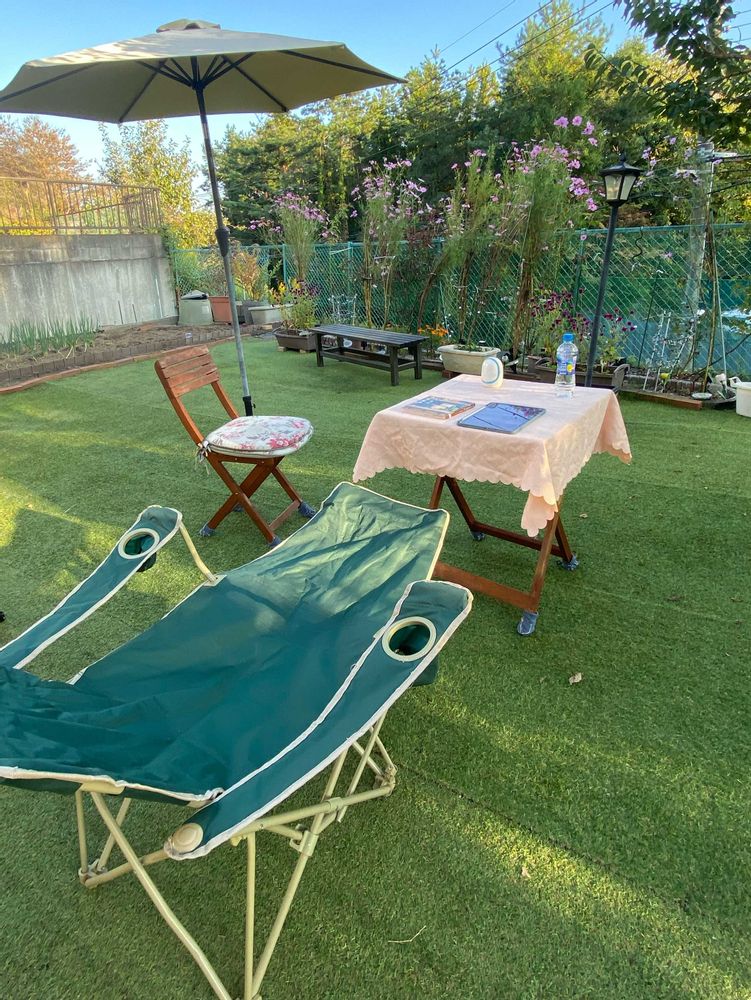 今日も秋晴れ。スポクラでの運動後、庭で寛ぐのが至福です。