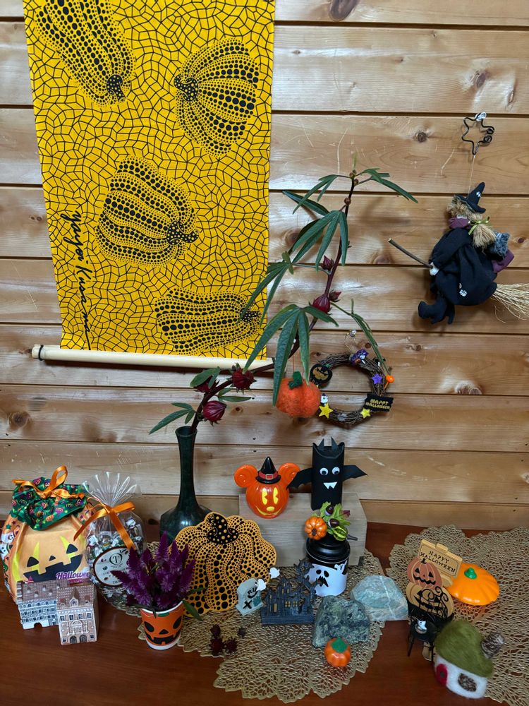 2枚目、玄関フロアをそれっぽくしてみたよ。お友達から頂いた🎃草間やよいのタペストリーが良い味だしてるわ。