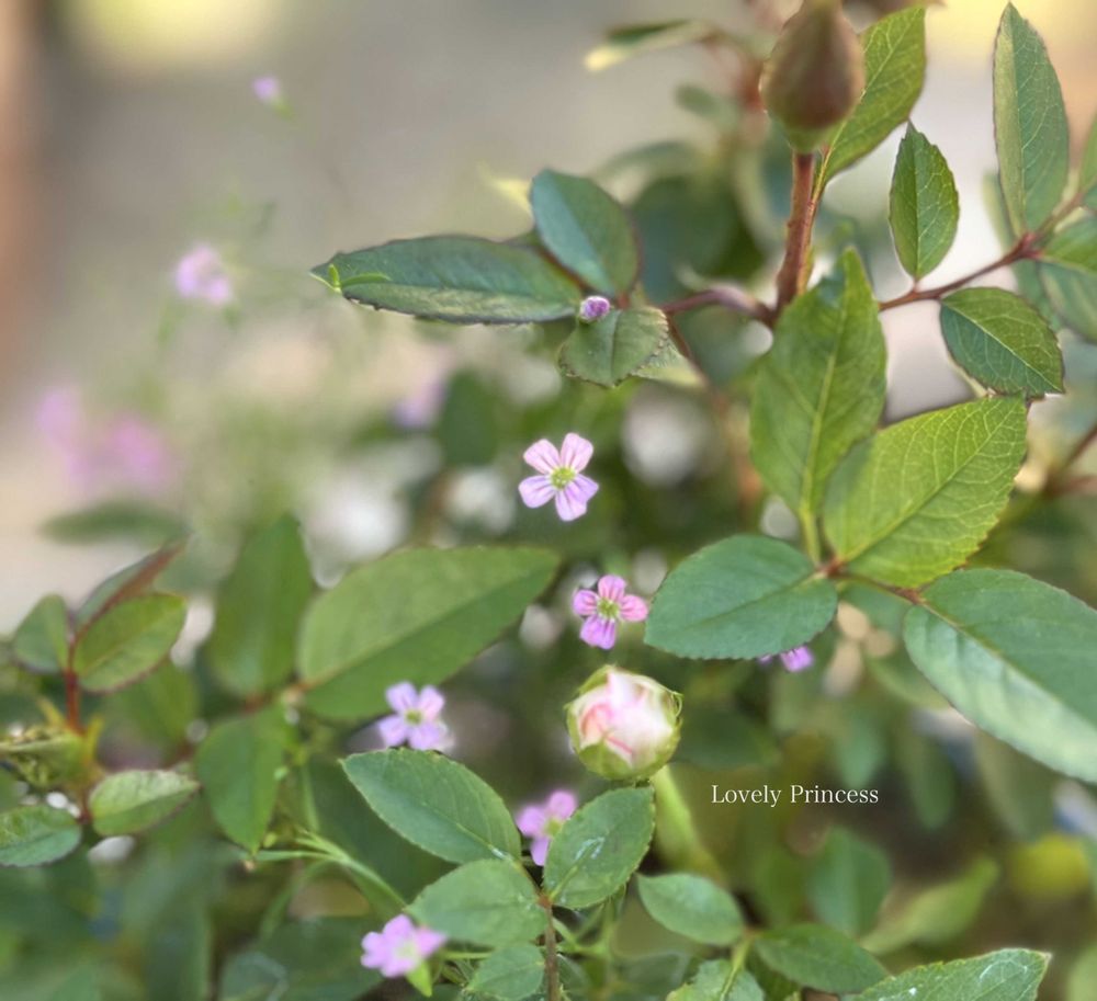 ミニ薔薇のラブリープリンセスが蕾を付け始め、まわりの溢れ種からのカスミソウも花数を増やしています🌸