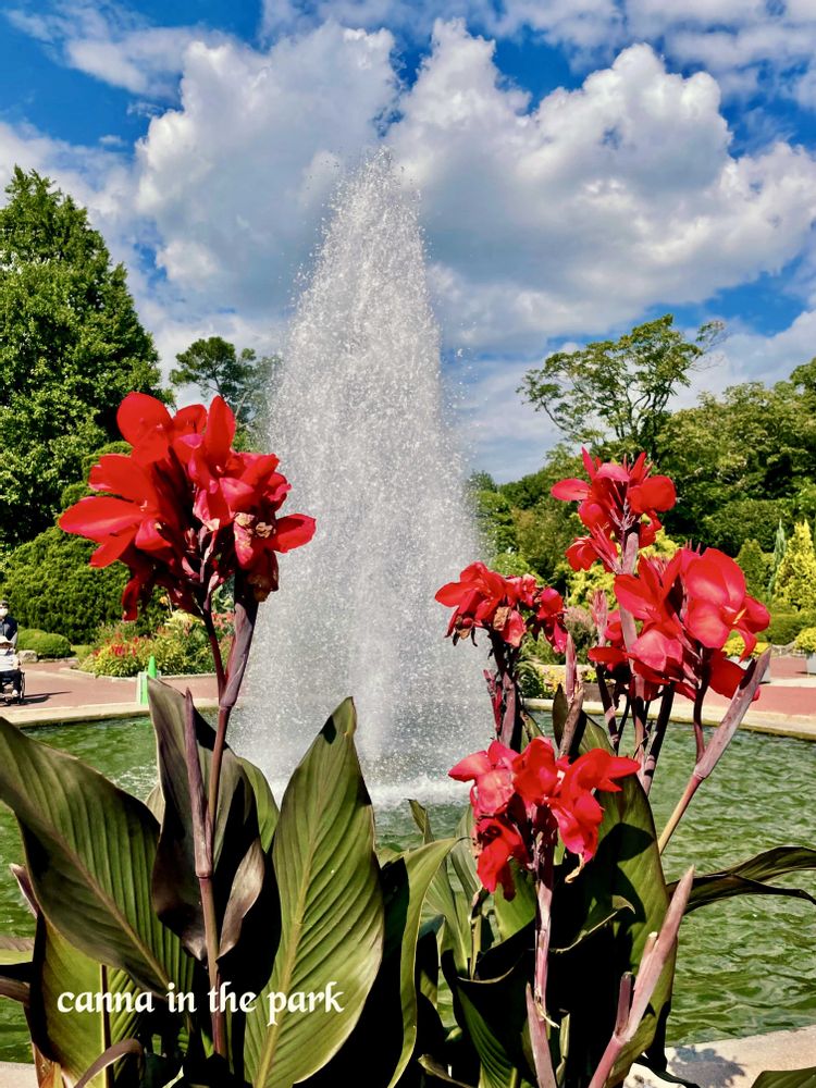 カンナちゃん、夏に元気なお花は嬉しいネ🌞💪✨…昨年夏に出かけた植物園内の噴水⛲️前でカンナが見頃になってて🥰