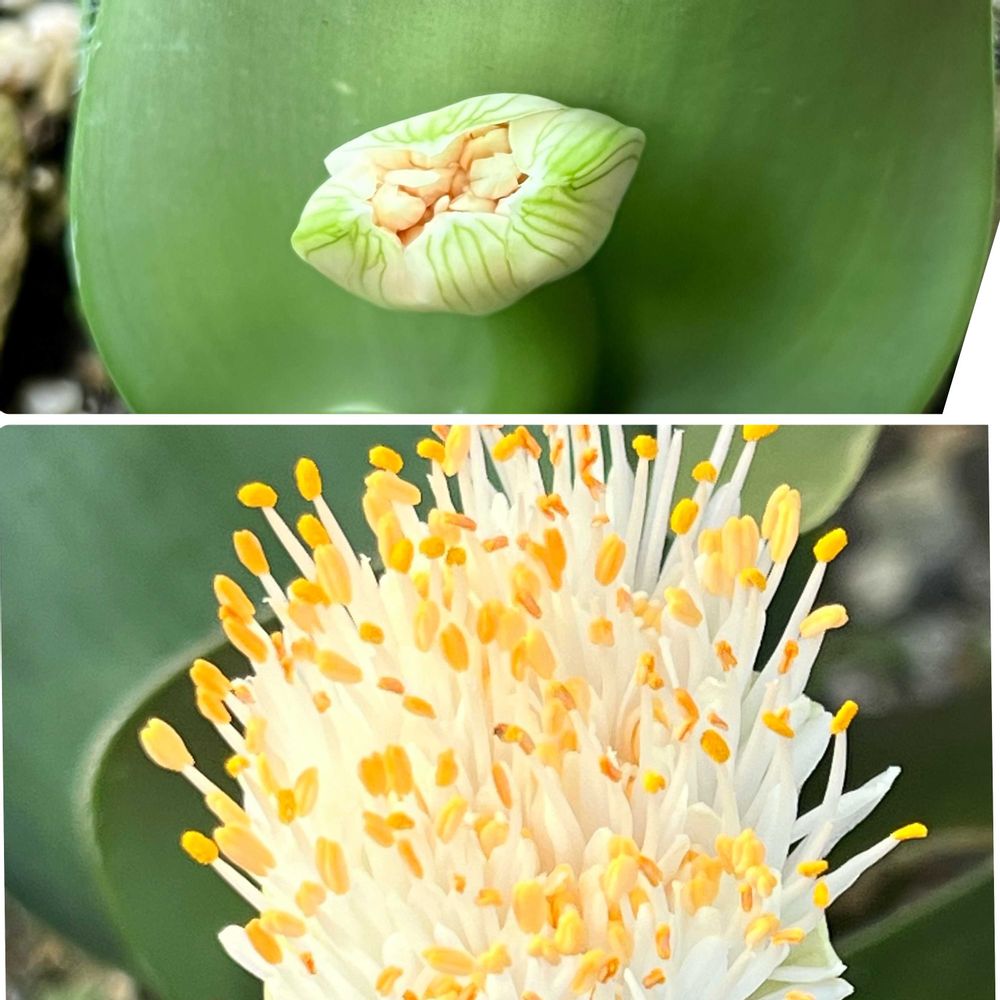 午前中に リハビリ運動行った時に 👀マユハケオモト少し開いてました3日前に見た時は しっかり頑な蕾が 今日は白くて黄色シベがツンツン咲き笑顔😆見せてくれてましたよー写メ撮るの忘れてた…😣