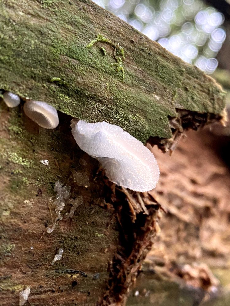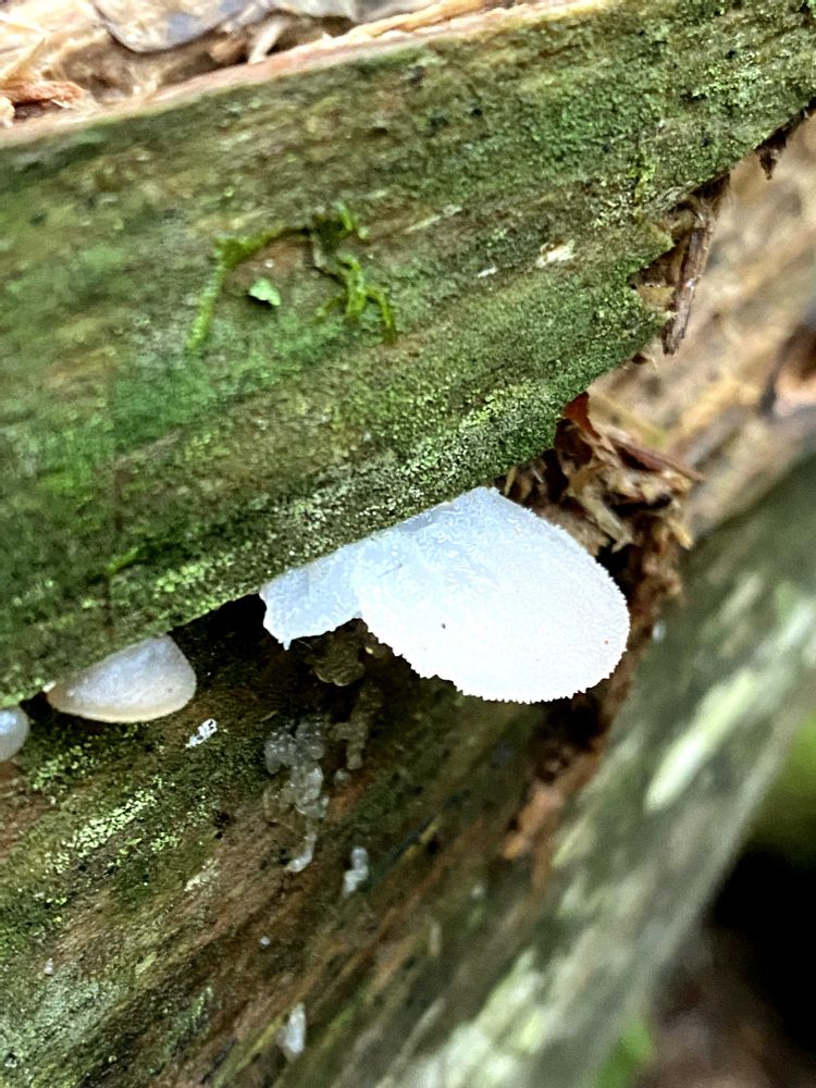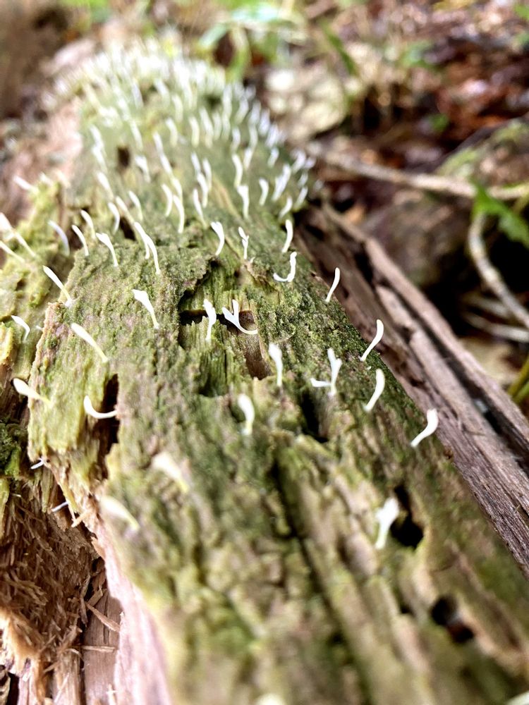 シラウオタケが生える足元を見ると、緑色の緑藻類が倒木を覆って居ます。