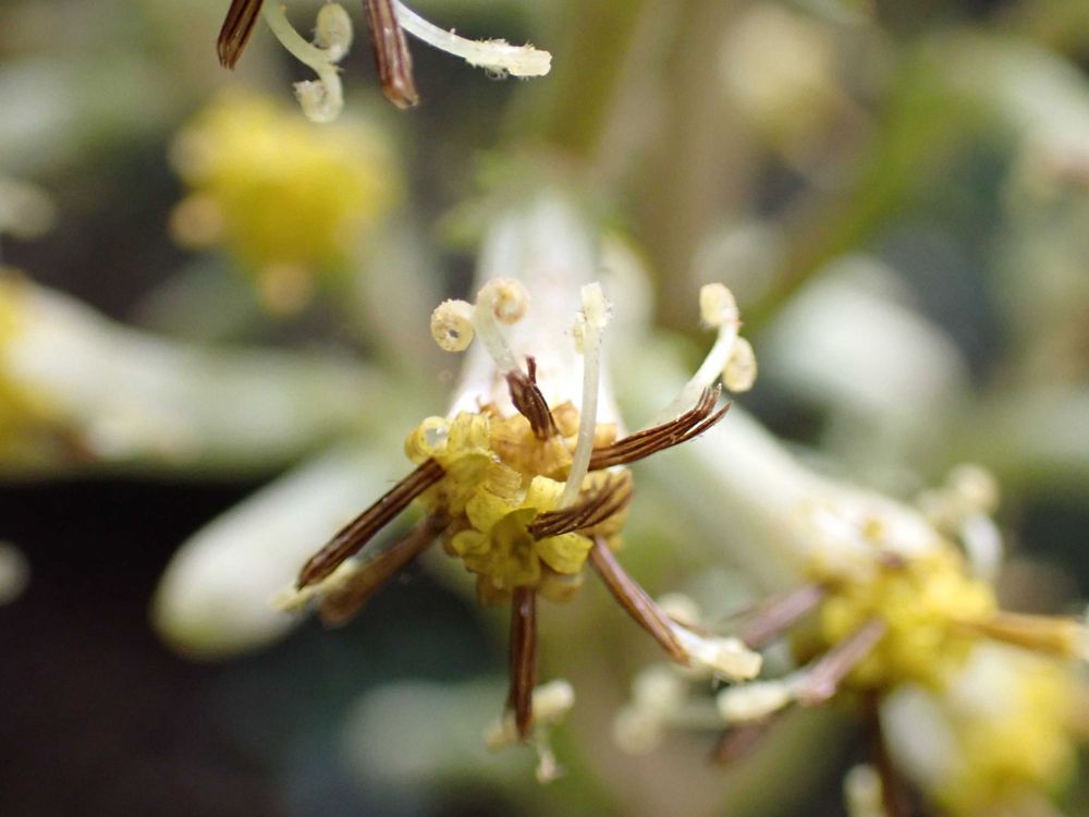 1つの花は、小さな5〜6個の花からできています。5個の雌蕊がくるんとしています。(②)