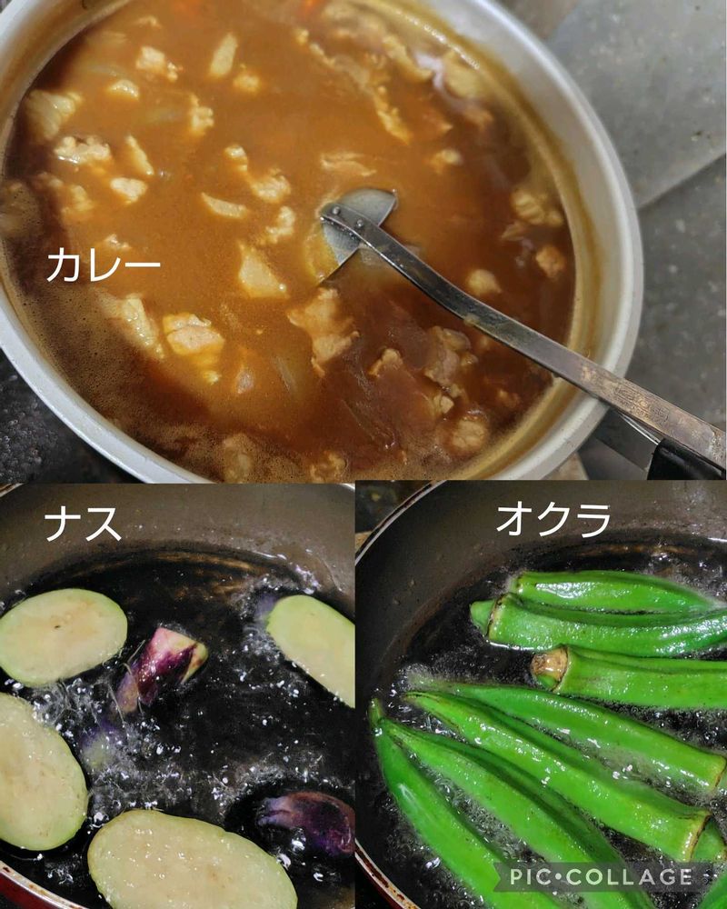 夜中にカレー作りとナスとオクラの素揚げの男料理ですぅでけた😚